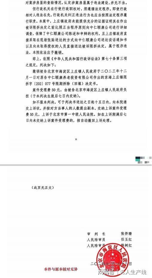 此前,海淀区法院已就上庄镇官方针对我司的强拆行为作出明确判决,认定其程序违法,强拆决定理应撤销。这一判决犹如一记重锤,狠狠敲碎了镇政府所谓“合法强拆”的伪装。海淀区法院的权威裁定,是对镇政府肆意践踏法律程序的有力回击,也让我们看到了法律的公正与威严。然而,上庄镇政府官方却对此置若罔闻,依旧我行我素,这种对法律判决的漠视,实在令人愤慨。